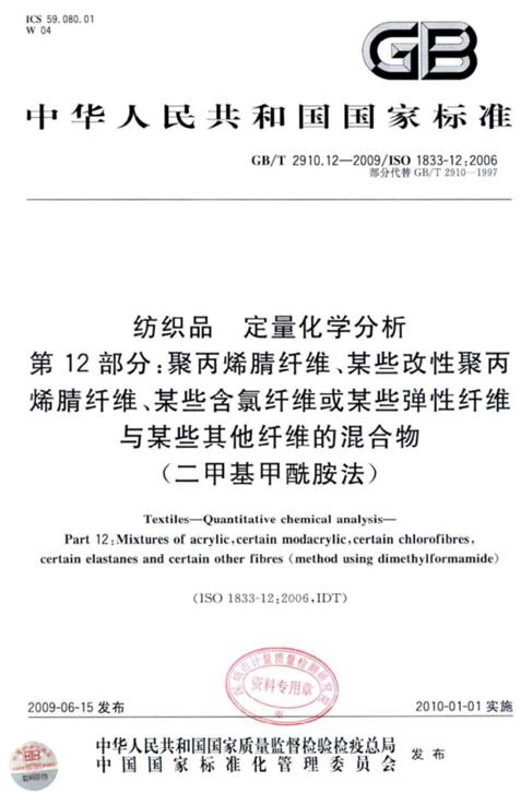 GB/T2910的本部分規(guī)定了采用二甲基甲酰胺法測定去除非纖維物質(zhì)后的由以下纖維組成的聚丙烯腈纖維、某些改性聚丙烯腈纖維、某些含氯纖維或某些彈性纖維與某些其他纖維的二組分混合物中聚丙烯腈纖維、某些改性聚丙烯腈纖維、某些含氯纖維或某些彈性纖維含量的方法;