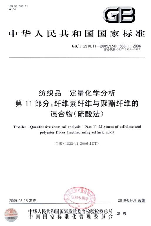 GB/T2910的本部分規(guī)定了采用硫酸法測定去除非纖維物質(zhì)后的天然或再生纖維素纖維和聚酯纖維的二組分混合物中纖維素纖維含量的方法.
