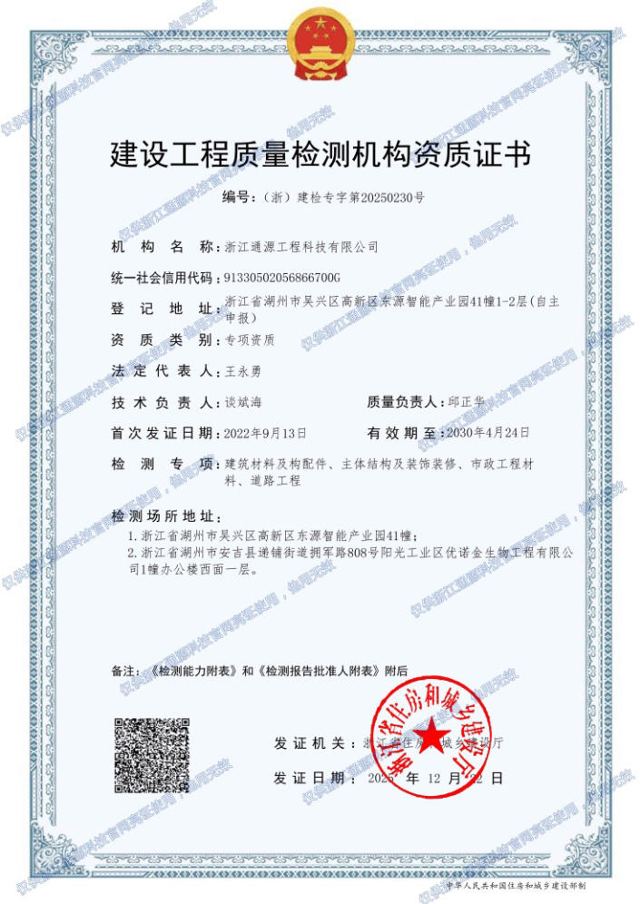 公司于2014年7月首次通過浙江省質(zhì)量技術(shù)監(jiān)督局組織的計(jì)量認(rèn)證,經(jīng)過多次檢測(cè)參數(shù)擴(kuò)項(xiàng),目前獲準(zhǔn)開展的檢測(cè)能力3300多項(xiàng),檢測(cè)服務(wù)領(lǐng)域涵蓋紡織品(童裝)、氣象防雷、水利工程、交通工程、市政房建、鐵路工程、排水管道檢測(cè)與評(píng)價(jià)、司法鑒定等。公司目前持有的專業(yè)質(zhì)量檢測(cè)資質(zhì)有:水利工程混凝土甲級(jí)、巖土甲級(jí)、量測(cè)乙級(jí)、金屬結(jié)構(gòu)乙級(jí)、機(jī)械電氣乙級(jí);公路工程乙級(jí)資質(zhì); 水運(yùn)工程材料乙級(jí)資質(zhì);雷電防護(hù)裝置檢測(cè)甲級(jí)資質(zhì);建設(shè)工程專項(xiàng)類檢測(cè)資質(zhì)[建設(shè)工程建筑材料及構(gòu)配件、主體結(jié)構(gòu)及裝飾裝修、市政工程材料、道路工程];管道檢測(cè)評(píng)價(jià)能力(丙級(jí));2019年3月我司被最高人民法院及浙江省高院列為司法鑒定機(jī)構(gòu)(交通工程質(zhì)量鑒定和設(shè)計(jì)、水運(yùn)工程、水利工程、市政工程質(zhì)量鑒定、工程檢測(cè))。公司目前持有的體系認(rèn)證證書有:ISO 9001質(zhì)量管理體系認(rèn)證、ISO 14001環(huán)境管理體系認(rèn)證、ISO 45001職業(yè)健康安全管理體系認(rèn)證。